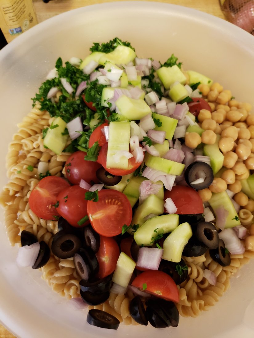-Combine all chopped veggies and chickpeas with pasta and pour the remaining olive oil and half of the lemon juice and then mix gently.